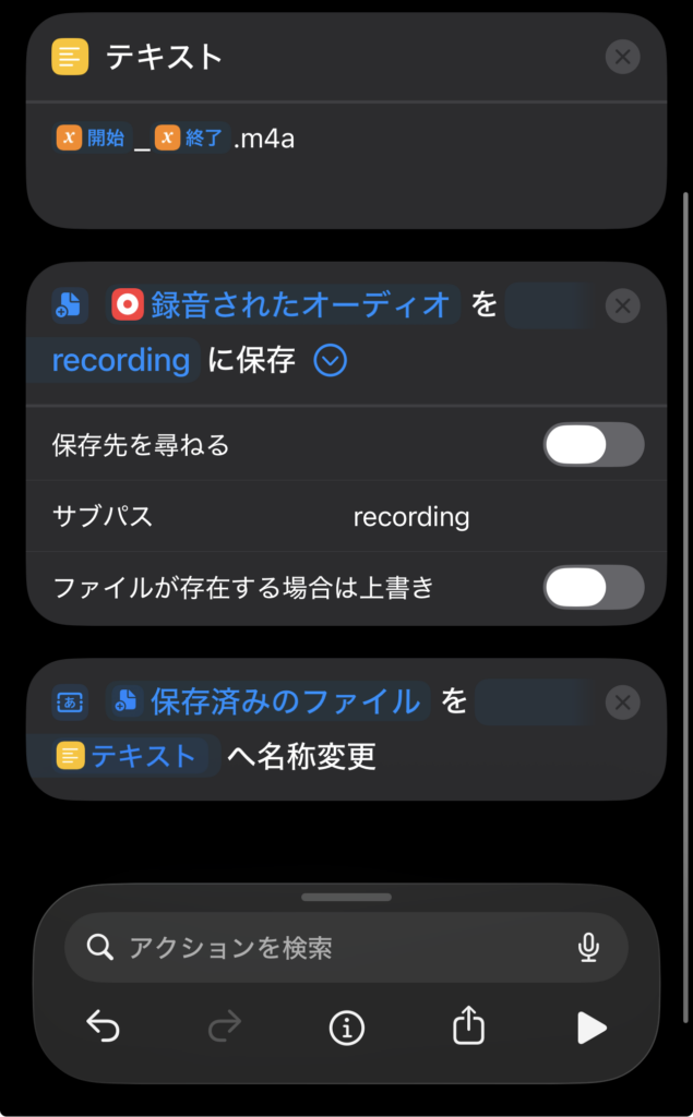 上に引っ張られて「テキストを保存」になってしまうかもしれない。その場合、「テキスト」を長押しして、変数を「録音されたオーディオ」に変更する